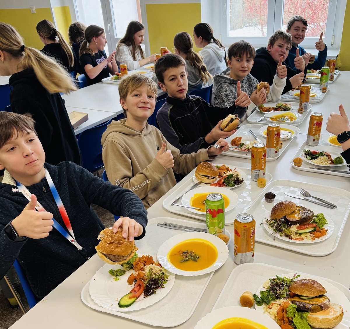 Na menu nechyběla lahodná dýňová polévka, šťavnatý hamburger s pečenými batáty a sladká tečka v podobě nadýchaných muffinů. Atmosféra byla úžasná a děti byly nadšené nejen z jídla, ale i z toho, že mohly nahlédnout pod ruce profesionálním kuchařům, kteří vařili přímo v naší školní kuchyni.
